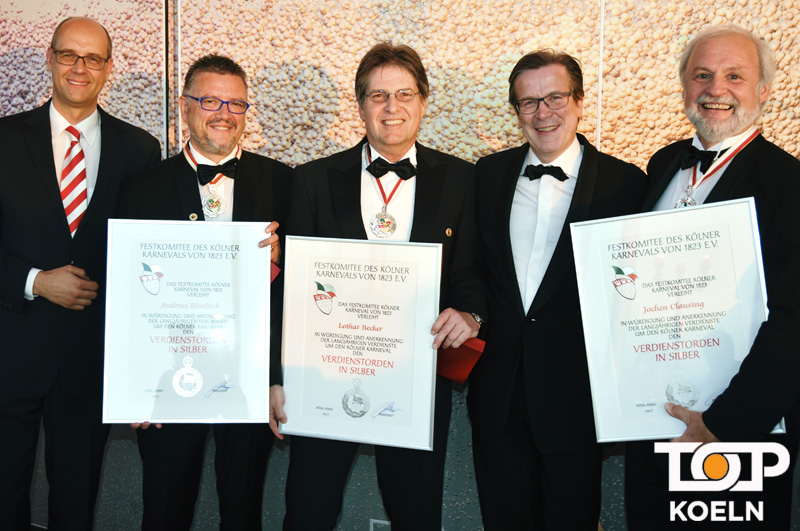 Des Weiteren wurden Prof. Dr. Andreas Müller-Wiedenhorn und Dominic Fausten zu neuen Senatoren der Stromlosen Ader ernannt. Aus der Hand von Senatspräsident Lothar Becker erhielten die Neu-Senatoren neben der Ernennungsurkunde auch ihre Senatsmütze und den Halsorden. Aber weitere Ehrungen sollten noch folgen: Bernd Barz wurde für seine Verdienste um den Verein zum Ehrensenator ernannt, bevor die Abordnung des Festkomitees Kölner Karnevals zur Tat schritt. Präsident Christoph Kuckelkorn und Michael Kramp, Mitgliedersevice, ehrten die mehr als überraschten Mitglieder der KKG Lothar Becker, Andreas Bösebeck und Jochen Clausing mit dem Verdienstorden des Festkomitees Kölner Karneval in Silber.